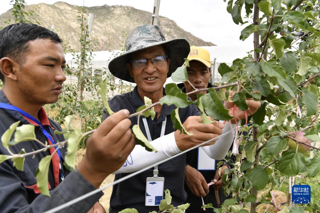 技術人員(中)在指導森布日村村民管理蘋果樹(資料圖)。新華社記者張汝鋒攝