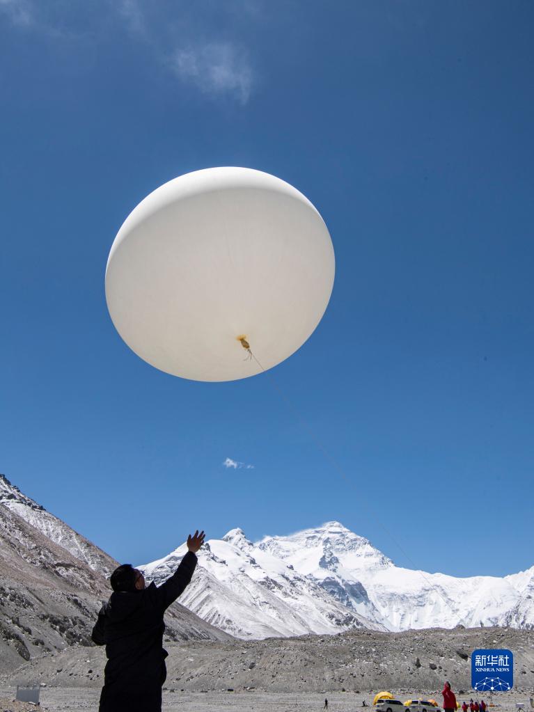 5月3日,在珠峰登山大本營(yíng),科研人員施放大氣臭氧探空氣球。新華社記者 孫非 攝