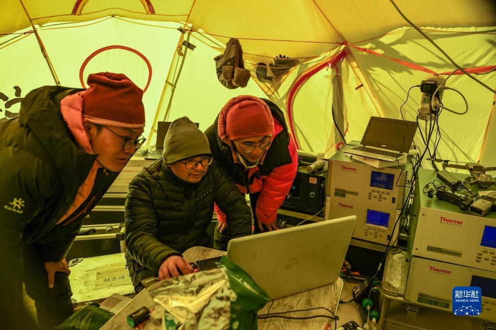 5月3日,在珠峰登山大本營(yíng),科研人員查看大氣數(shù)據(jù)。新華社記者 姜帆 攝