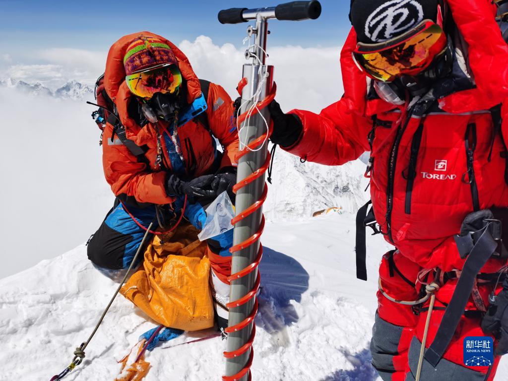 5月4日,德慶歐珠帶領(lǐng)的登頂小組科考隊員,在珠峰海拔8830米處架設(shè)世界海拔最高自動氣象站,建成珠峰梯度氣象觀測體系;在峰頂首次利用高精度雷達測量冰雪厚度,并采集了峰頂冰雪樣品。