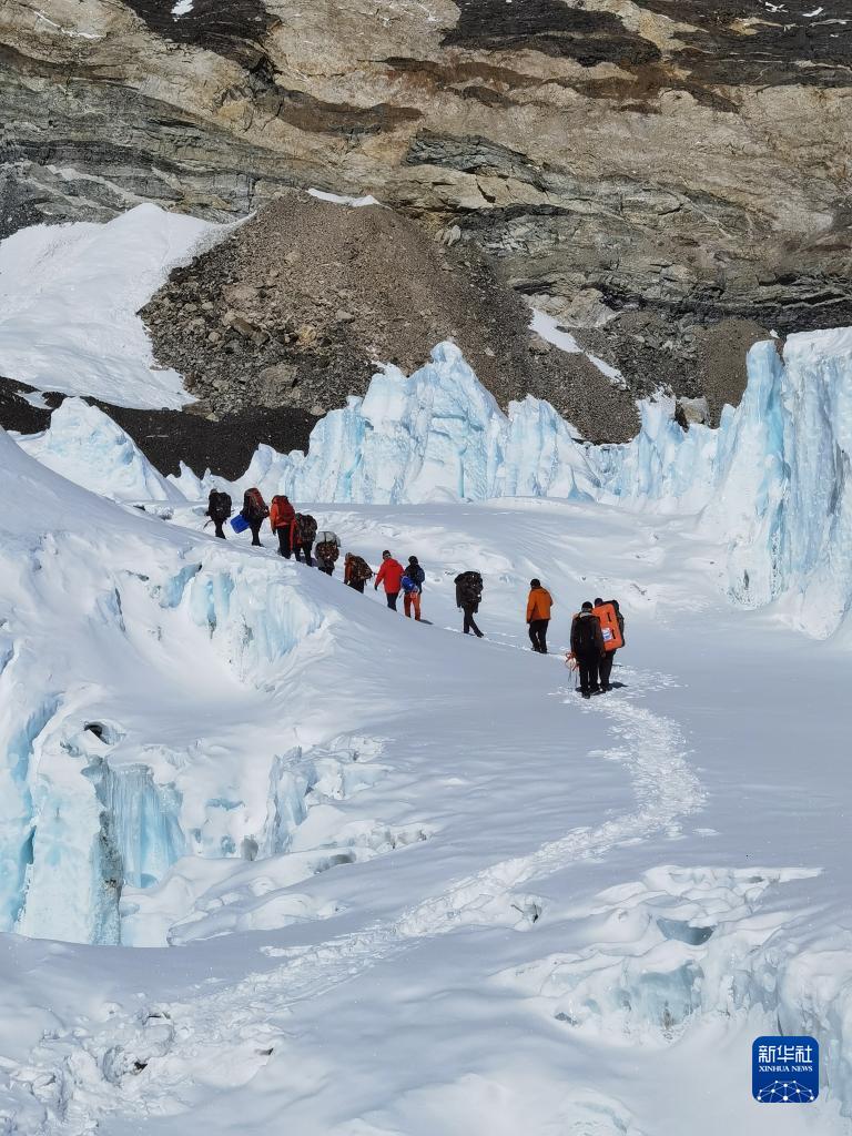 冰雪與污染物考察分隊在東絨布冰川區(qū)域進行科學(xué)考察(5月7日攝)。新華社發(fā)(康世昌 攝)