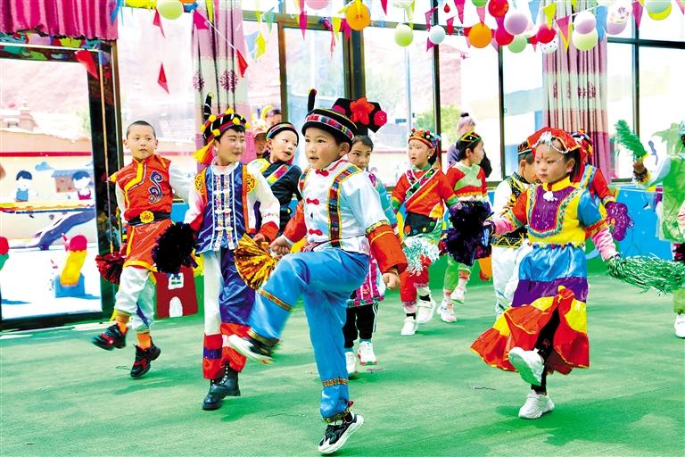 山南市瓊結縣下水村雙語幼兒園的孩子們在表演民族團結進步舞蹈《愛我中華》。通訊員 倫珠澤仁 記者 次旺 攝