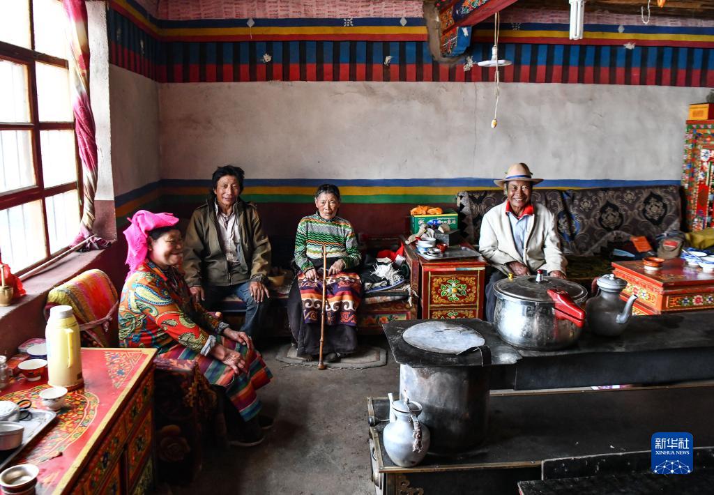 貢覺(右一)一家人在雙湖縣多瑪鄉(xiāng)果根擦曲村的家中(7月12日攝)。新華社記者 晉美多吉 攝