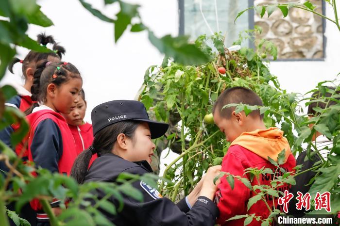 圖為亞東出入境邊防檢查站民警楊琳帶著龐達村雙語幼兒園小朋友認識成熟了的西紅柿。李錦輝 攝