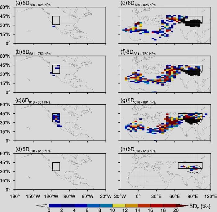 目前,不同地表介質(zhì)中穩(wěn)定同位素出現(xiàn)“反高程效應(yīng)”的原因仍然不明。對此,中外合作研究團(tuán)隊發(fā)現(xiàn),在美國西部和亞洲干旱區(qū)(從紅海到青藏高原北部)等地區(qū)對流層中層的水汽穩(wěn)定同位素也類似存在“反高程效應(yīng)”,而且其空間分布格局與地表介質(zhì)中穩(wěn)定同位素“反高程效應(yīng)”的空間分布格局基本一致。