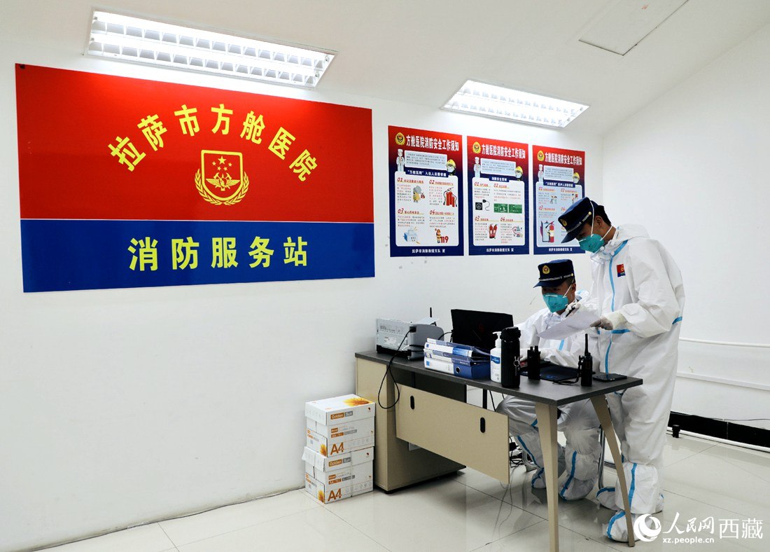方艙醫(yī)院消防服務站中消防人員在工作。人民網 次仁羅布 攝
