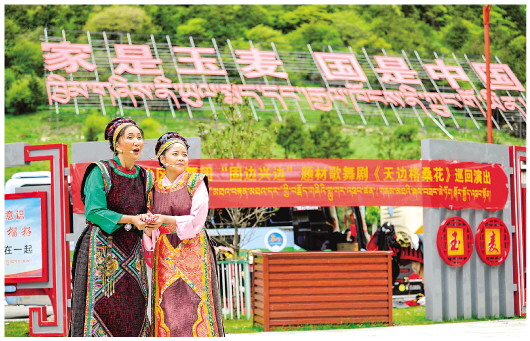5月31日,演員在隆子縣玉麥鄉(xiāng)文化廣場表演歌舞劇《天邊格?;ā?。 新華社記者張汝鋒攝
