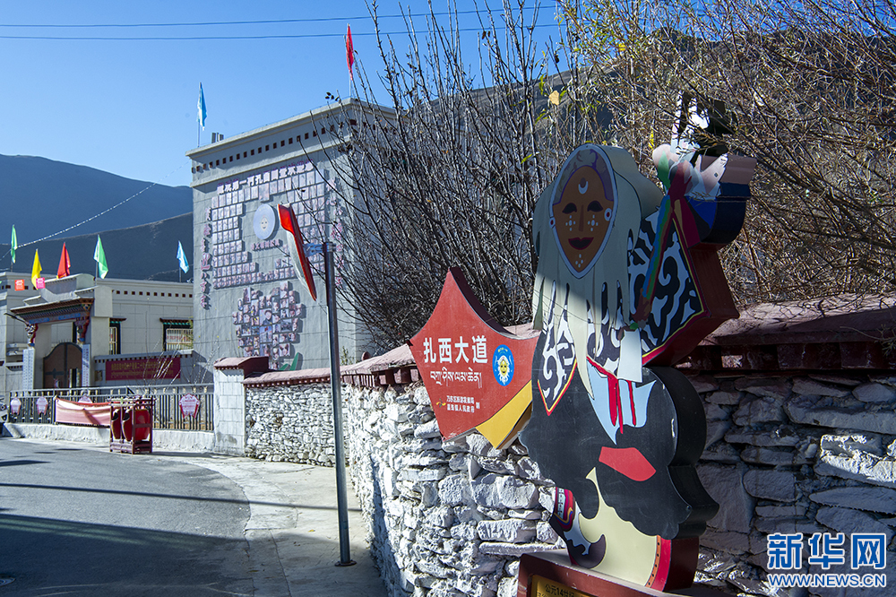圖為扎西曲登社區(qū)街邊的藏戲主題指示牌(12月9日攝)。新華網(wǎng) 旦增努布 攝