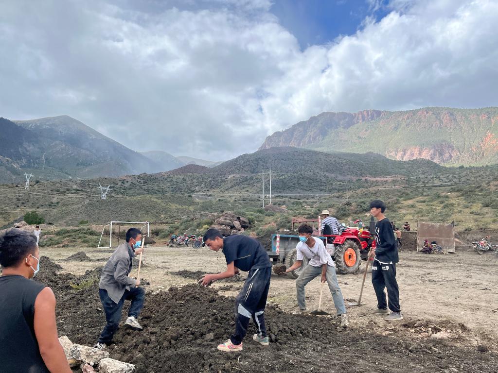 馬利鎮(zhèn)馬利村的孩子正在跟大人們一起平整場(chǎng)地。