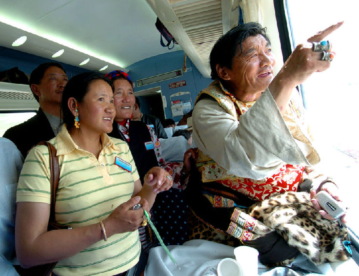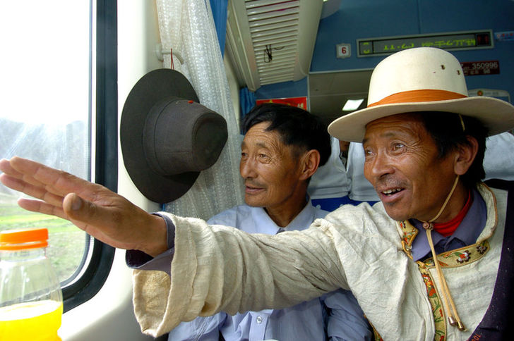 2006年7月1日,烏金(右一)在“藏2”次列車(chē)經(jīng)過(guò)自己家鄉(xiāng)安多時(shí),興奮地指向車(chē)外,向同伴介紹。