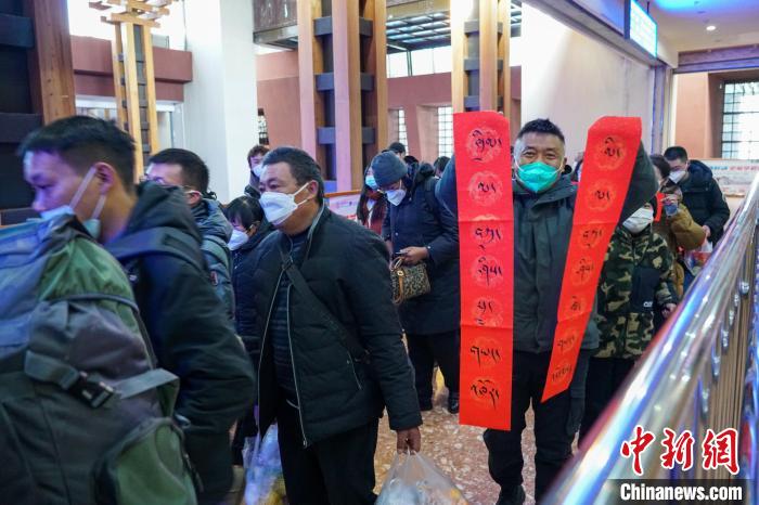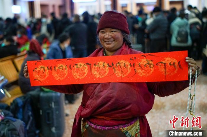 圖為春運(yùn)首日,拉薩火車站一旅客獲得車站送的藏式春聯(lián),上面書寫的是藏語(yǔ)“扎西德勒 吉祥如意”?!〗w波 攝
