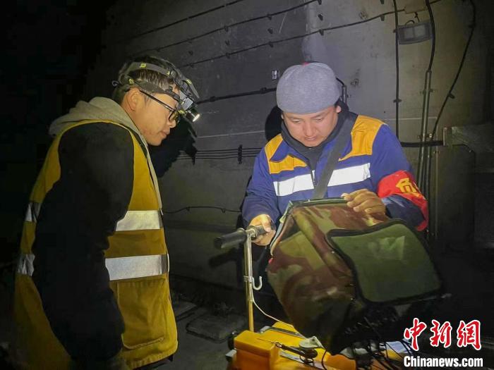 次旦平措(右)與同事深夜在拉林鐵路進行鋼軌探傷作業(yè)。 馬生明 攝