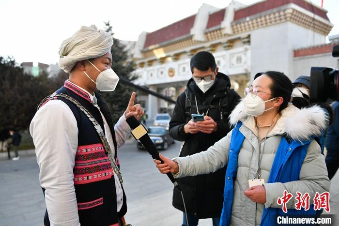 1月12日,政協(xié)第十二屆西藏自治區(qū)委員會第一次會議在拉薩開幕,西藏政協(xié)文化藝術(shù)節(jié)界委員迪龍(左)接受媒體的采訪。 中新社記者 貢嘎來松 攝