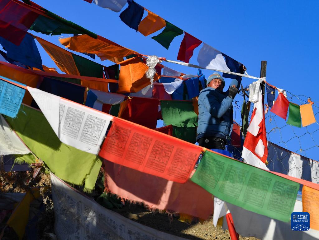 1月23日,西藏拉孜縣曲瑪鄉(xiāng)的藏族群眾在山上豎起五彩經(jīng)幡。新華社記者 晉美多吉 攝