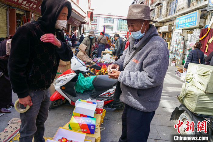 圖為2月13日,拉薩沖賽康市場周圍,市民(右)向29歲的巴桑(左)購買藏歷新年年貨酥油花。中新社記者 江飛波 攝