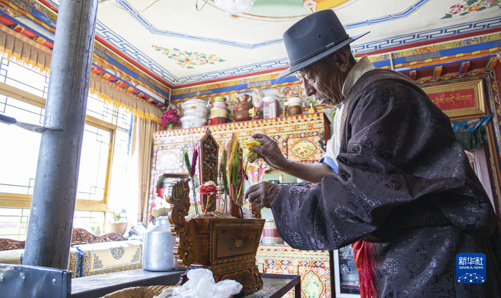 2月20日,在位于西藏拉薩市墨竹工卡縣門巴鄉(xiāng)的家中,扎西次仁用五彩青稞穗裝點象征吉祥的“切瑪”。新華社發(fā)(丁增尼達(dá) 攝)