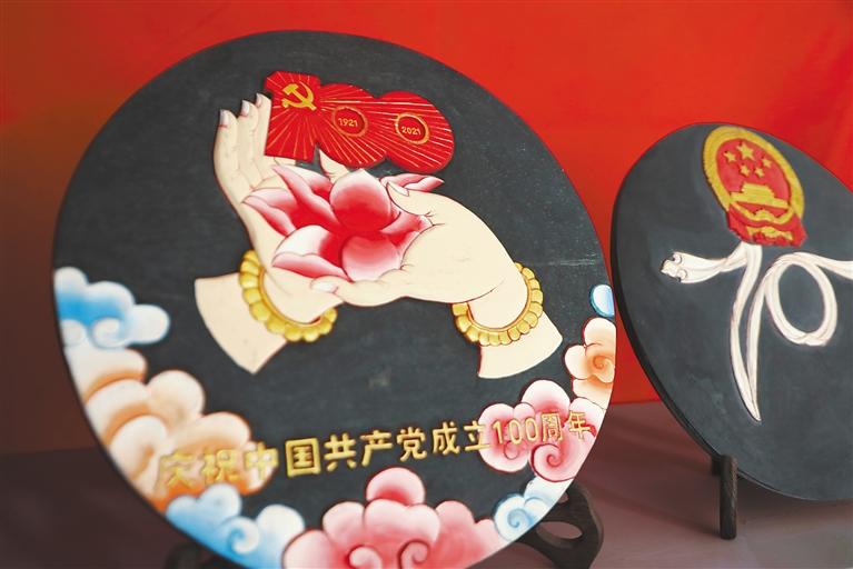 “我們首先要選好一塊石頭,根據(jù)它的形狀和質(zhì)地來決定刻成一幅什么樣的作品,然后再畫出作品的輪廓進行雕刻,最后一步則為上色?!鄙V懿湃薀崆榈貛覀儏⒂^他的工作室,“慶祝中國共產(chǎn)黨成立100周年”“牧家生活”“扎西德勒”“白海螺”“和氣四瑞像”……每一幅作品活靈活現(xiàn)在大大小小石板上,栩栩如生、惟妙惟肖,堅硬的石頭在他出神入化的雕工下竟變得柔軟,又不失力量和美感。