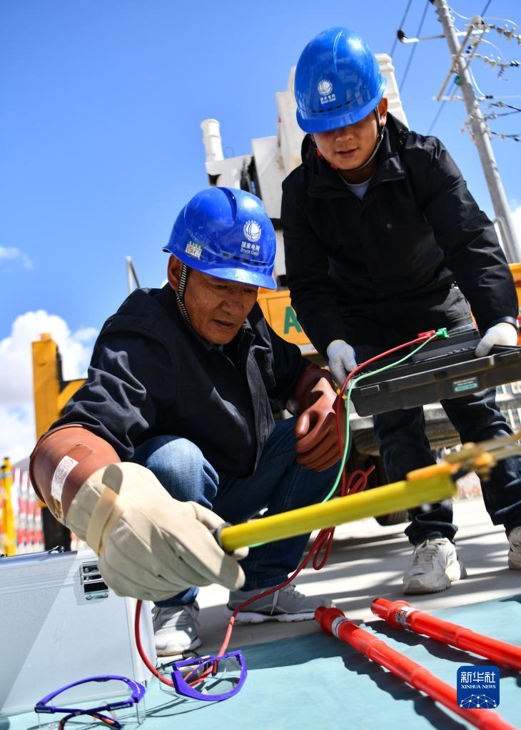 4月26日,扎西尼瑪(左)在進(jìn)行絕緣電阻檢測。新華社記者 劉洲鵬 攝