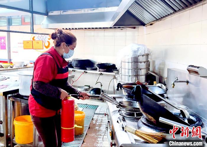 模擬廚房發(fā)生火災(zāi),員工發(fā)現(xiàn)火源后,立即關(guān)閉燃?xì)忾y,拉閘斷電,第一時(shí)間利用周邊滅火器進(jìn)行初期火災(zāi)撲救。 劉瑜 攝