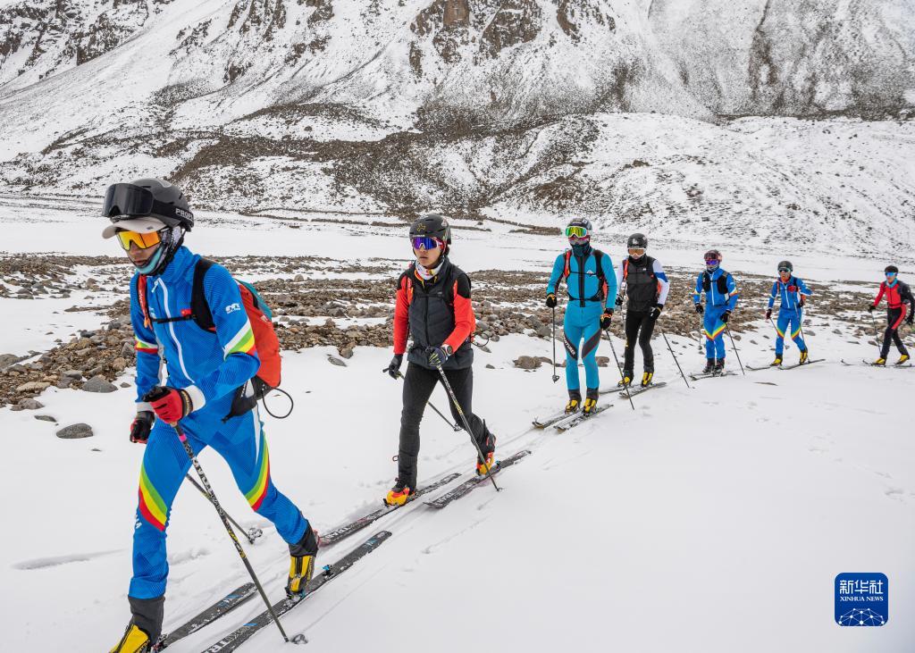 在西藏拉薩市當雄縣羊八井鎮(zhèn),玉珍拉姆(左二)和隊友進行滑雪登山訓練(5月2日攝)。新華社記者 孫非 攝