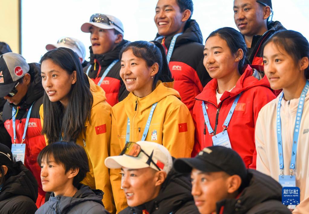 在新疆富蘊縣,玉珍拉姆(中排右三)和參與全國首屆滑雪登山冠軍賽的西藏代表隊隊友合影留念(4月7日攝)。新華社記者 胡虎虎 攝