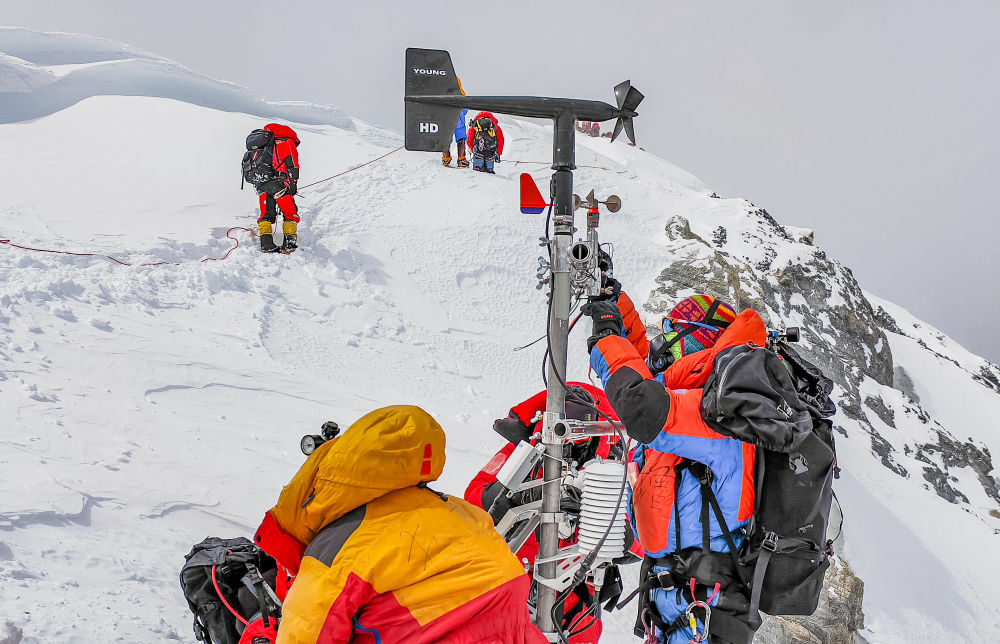 當(dāng)日凌晨3時(shí),科考隊(duì)員從海拔8300米的突擊營地出發(fā),歷經(jīng)數(shù)小時(shí)攀登,終于抵達(dá)海拔8830米的世界最高自動(dòng)氣象觀測(cè)站。固定鋼筋繩索,更換蓄電池,安裝風(fēng)速風(fēng)向傳感器……經(jīng)過約1小時(shí)的緊張工作,氣象站零部件升級(jí)工作全部完成。隨后,他們攀登至8848.86米的峰頂,利用工具成功采集雪冰樣品。