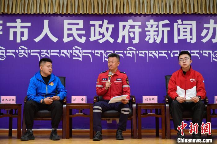 圖為拉薩市青年志愿救援隊(duì)代表陳雷(中)正在分享志愿服務(wù)經(jīng)歷?!∝暩聛硭?攝