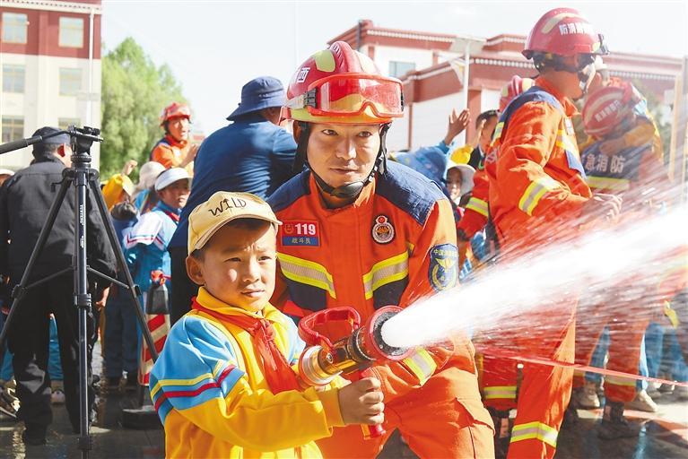 日喀則市小學(xué)學(xué)生體驗(yàn)滅火救援器材。肖暄 攝