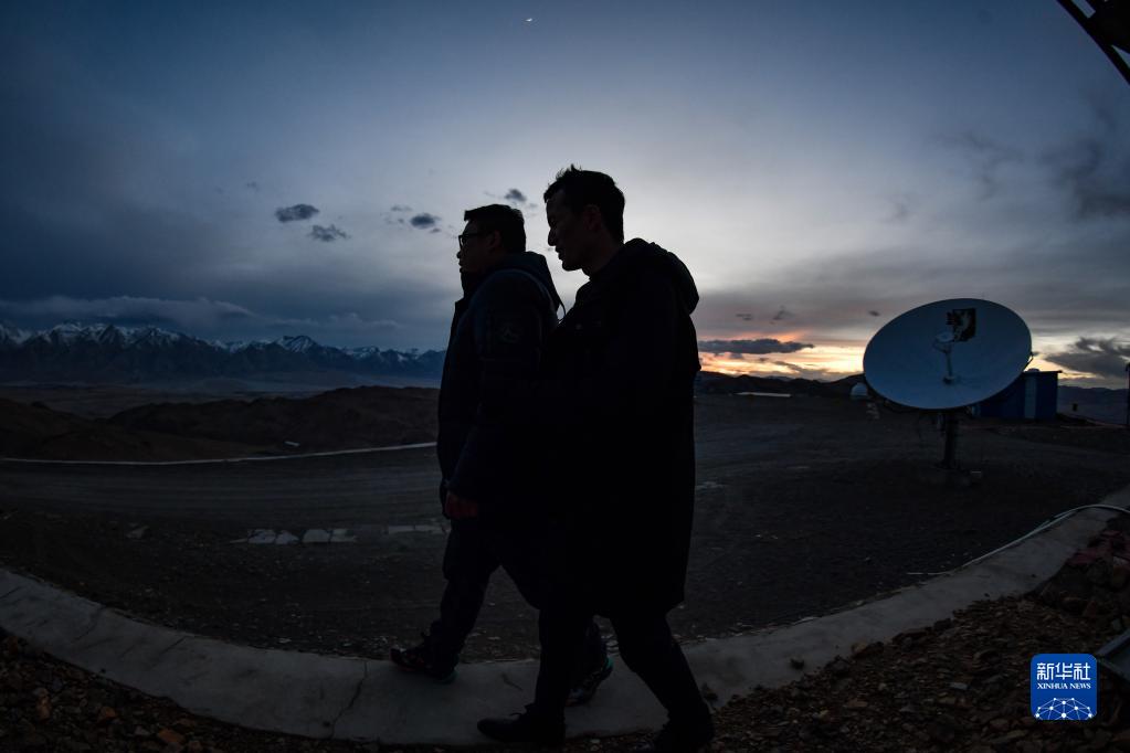 尤顯龍(左)和同事唐鵬在討論觀測(cè)到的數(shù)據(jù)(5月23日攝)。新華社記者 晉美多吉 攝