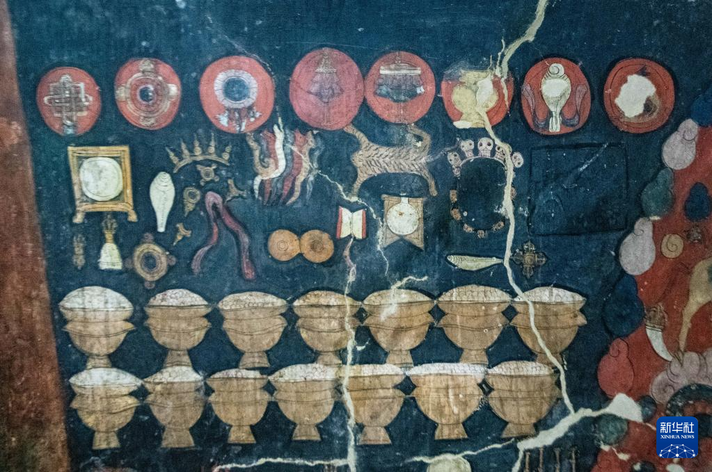 這是5月26日拍攝的皮央石窟壁畫中的吉祥八寶。新華社記者 晉美多吉 攝