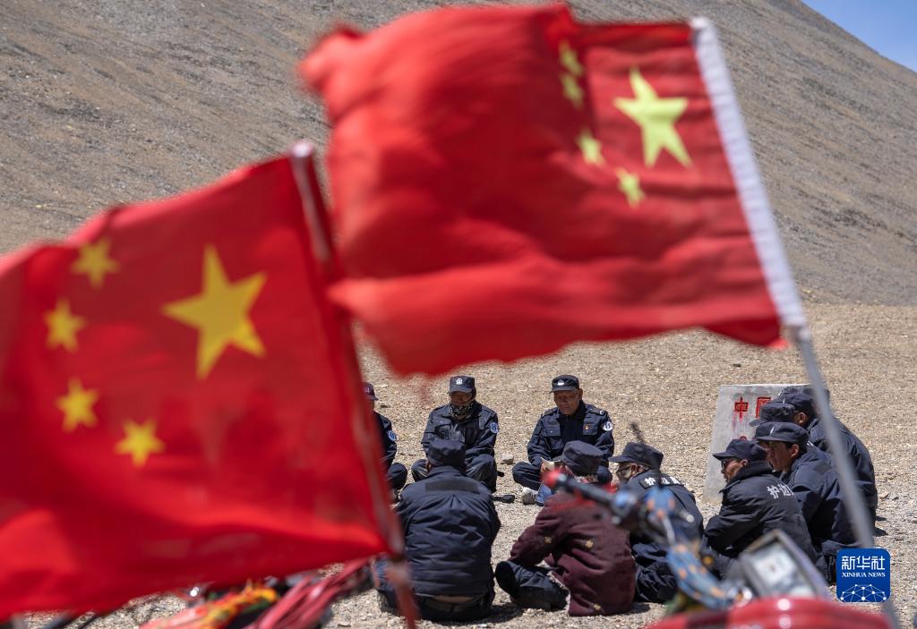 6月2日,在33號(hào)界樁處,護(hù)邊聯(lián)防隊(duì)在隊(duì)長(zhǎng)石角(右二)的帶領(lǐng)下學(xué)習(xí)。新華社記者 晉美多吉 攝