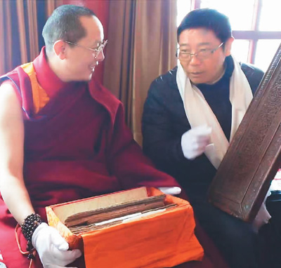 項(xiàng)目總顧問丁真俄色(左)與西藏自治區(qū)古籍保護(hù)中心研究館員、古籍專家白張?zhí)接懝偶Wo(hù)。