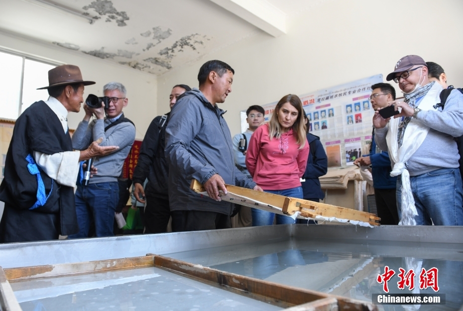 6月15日,西藏拉薩,記者們在尼木縣非遺工坊(藏紙制作廠)采訪了解藏紙。在第五屆中國西藏旅游文化國際博覽會召開之際,國務院新聞辦組織中外媒體記者赴西藏采訪,路透社、共同社、西班牙埃菲社、意大利安莎社、新加坡《聯(lián)合早報》和中央廣電總臺、中國日報等15家媒體的20名記者參加。6月15日,采訪團一行前往拉薩市尼木縣參訪體驗西藏傳統(tǒng)藏香、藏紙文化。