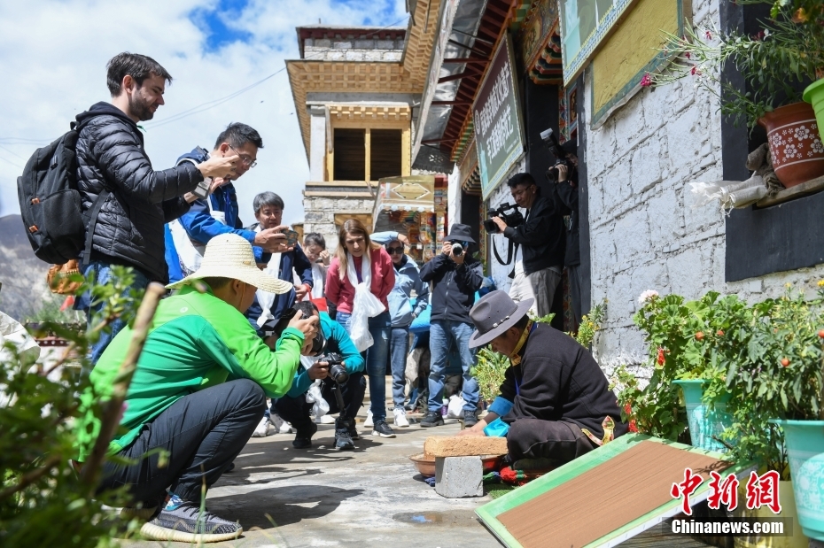 6月15日,西藏拉薩,中外記者們在尼木縣吞巴鎮(zhèn)吞達村采訪拍攝藏香制作過程。在第五屆中國西藏旅游文化國際博覽會召開之際,國務院新聞辦組織中外媒體記者赴西藏采訪,路透社、共同社、西班牙埃菲社、意大利安莎社、新加坡《聯(lián)合早報》和中央廣電總臺、中國日報等15家媒體的20名記者參加。6月15日,采訪團一行前往拉薩市尼木縣參訪體驗西藏傳統(tǒng)藏香、藏紙文化。