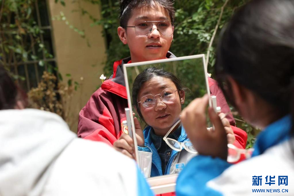 ?? 在西藏自治區(qū)那曲市色尼區(qū)第二中學(杭嘉中學),志愿者狄璐琬正引導戴上試戴架的學生適應眼鏡清晰度(6月22日攝)。新華社發(fā)(趙穎碩 攝)