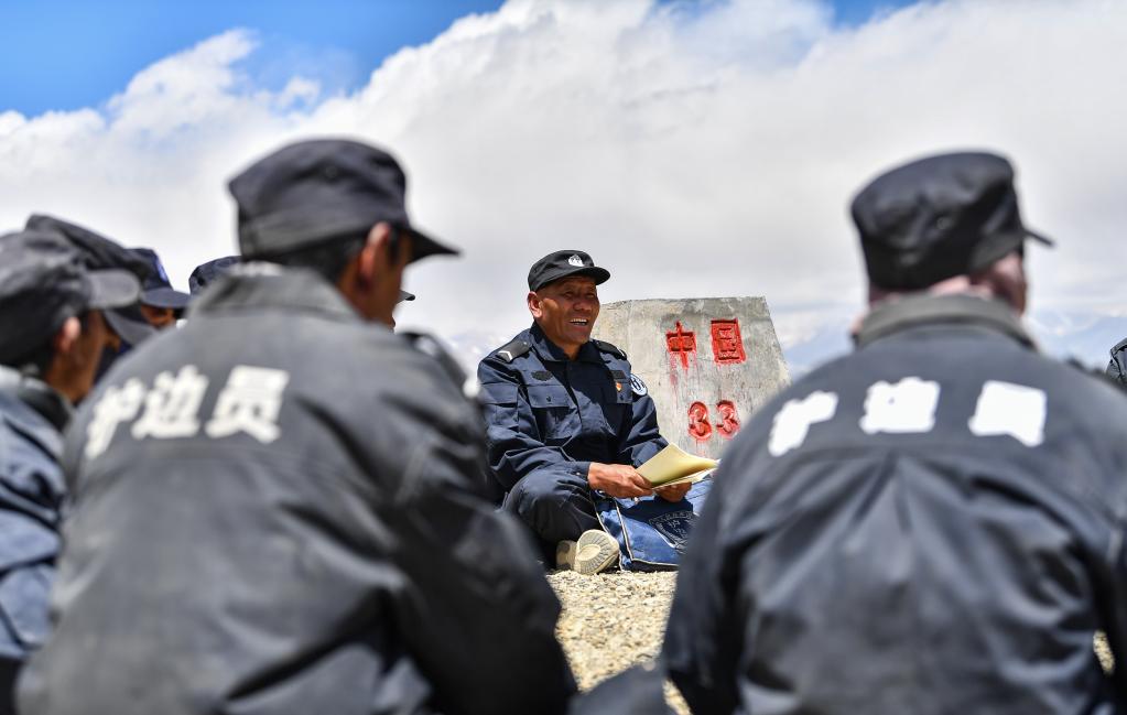 在33號界碑處,護邊隊在隊長石角(右二)的帶領下開展學習(6月2日攝)。新華社記者 晉美多吉 攝