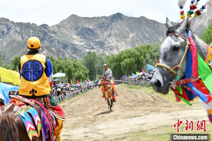 7月24日,在西藏自治區(qū)拉薩市曲水縣曲水鎮(zhèn)茶巴朗村村民身著節(jié)日盛裝進(jìn)行賽馬和馬術(shù)表演歡度“望果節(jié)”。“望果節(jié)”已有1500多年的歷史,是國(guó)家級(jí)非物質(zhì)文化遺產(chǎn),流行于西藏拉薩、日喀則、山南等地。