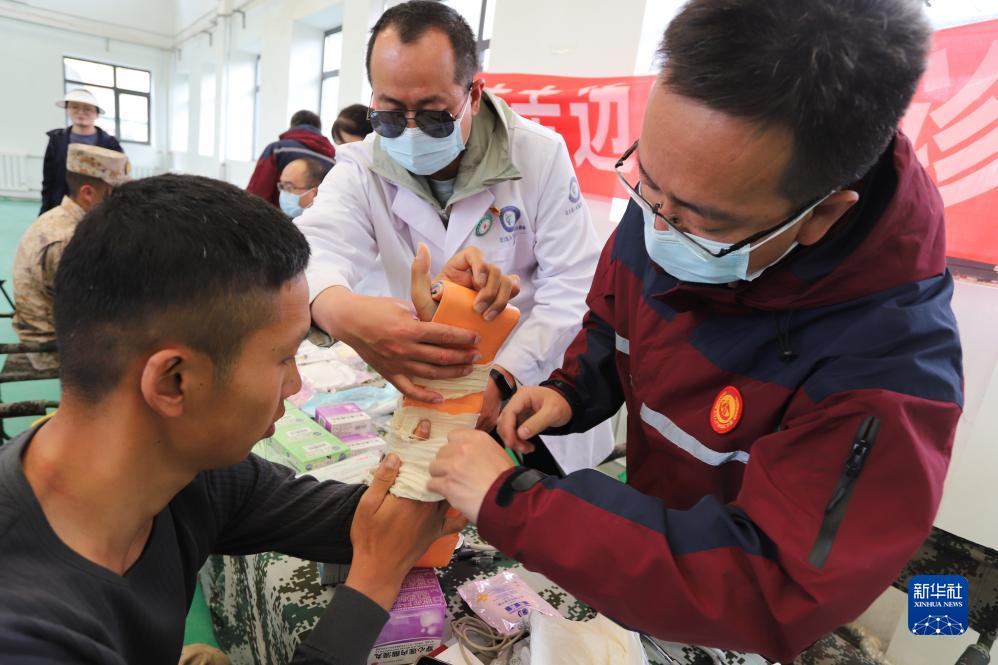 參加義診活動(dòng)的骨科醫(yī)生在西藏阿里地區(qū)某邊防連為戰(zhàn)士做康復(fù)治療(7月27日攝)。新華社 關(guān)明輝 攝