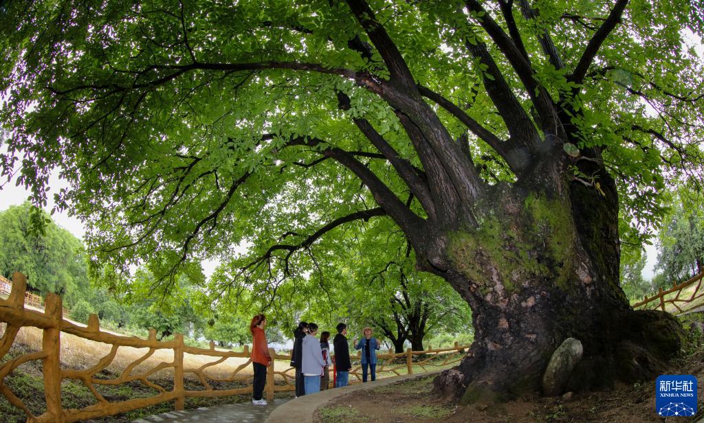 劉利平博士在加查縣安繞鎮(zhèn)熱果村查看一株樹齡1800余年的古核桃樹(7月27日攝)。新華社記者 旦增尼瑪曲珠 攝