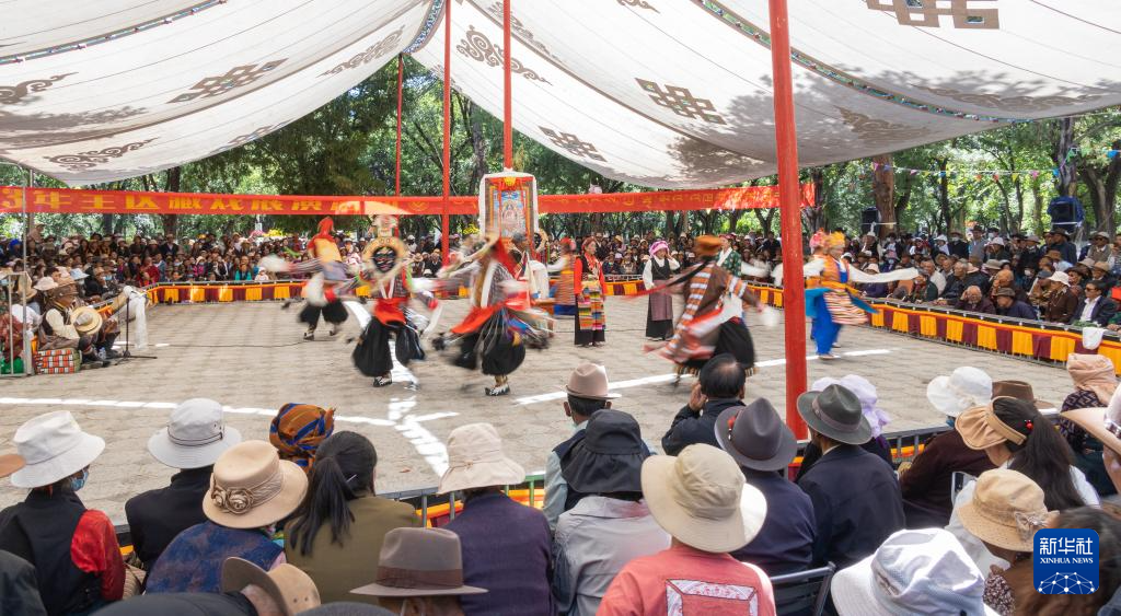 8月19日,在拉薩市羅布林卡園林內(nèi),貢嘎縣乃薩藏戲隊(duì)在為觀眾表演藏戲《朗薩雯崩》。新華社發(fā)(丁增尼達(dá)攝)