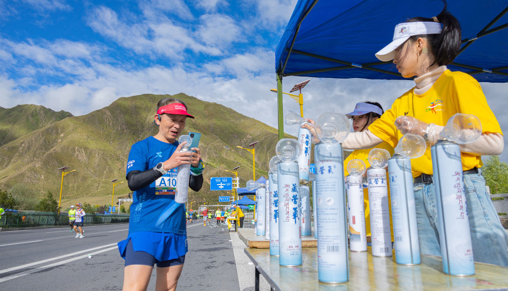 馬拉松愛好者正在領(lǐng)取氧氣罐。新華社發(fā)(丁增尼達(dá) 攝)