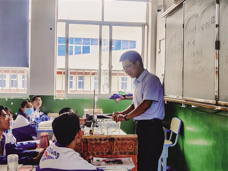 “李老師非常平易近人、和藹可親,他會(huì)帶著我們做化學(xué)實(shí)驗(yàn),在實(shí)驗(yàn)中可以了解到很有趣的知識(shí),讓我們更加快樂(lè)地學(xué)習(xí)。”拉薩市第八中學(xué)九年級(jí)二班的同學(xué)們表示,李老師關(guān)心每個(gè)人的學(xué)習(xí)狀況,如果有人在考試中表現(xiàn)不佳,李老師會(huì)親自講解,并在試卷上標(biāo)注出需要改正的錯(cuò)誤。下課后,李老師也會(huì)認(rèn)真傾聽學(xué)生們的想法和感受,與孩子們互動(dòng)交流。