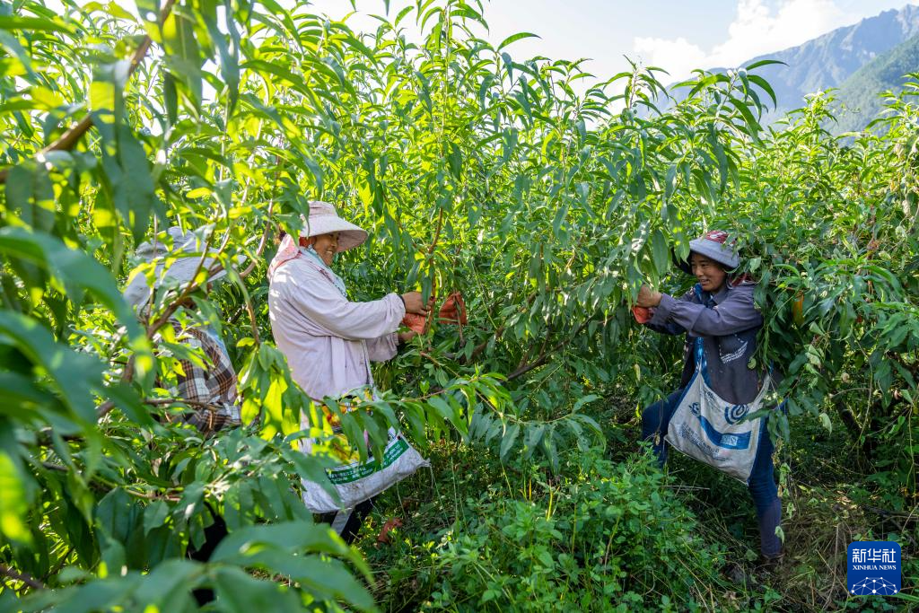 在西藏察隅縣下察隅鎮(zhèn),當?shù)卮迕裾诓烧S桃(9月3日攝)。新華社記者 孫非 攝