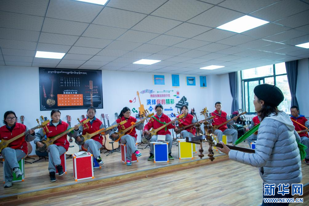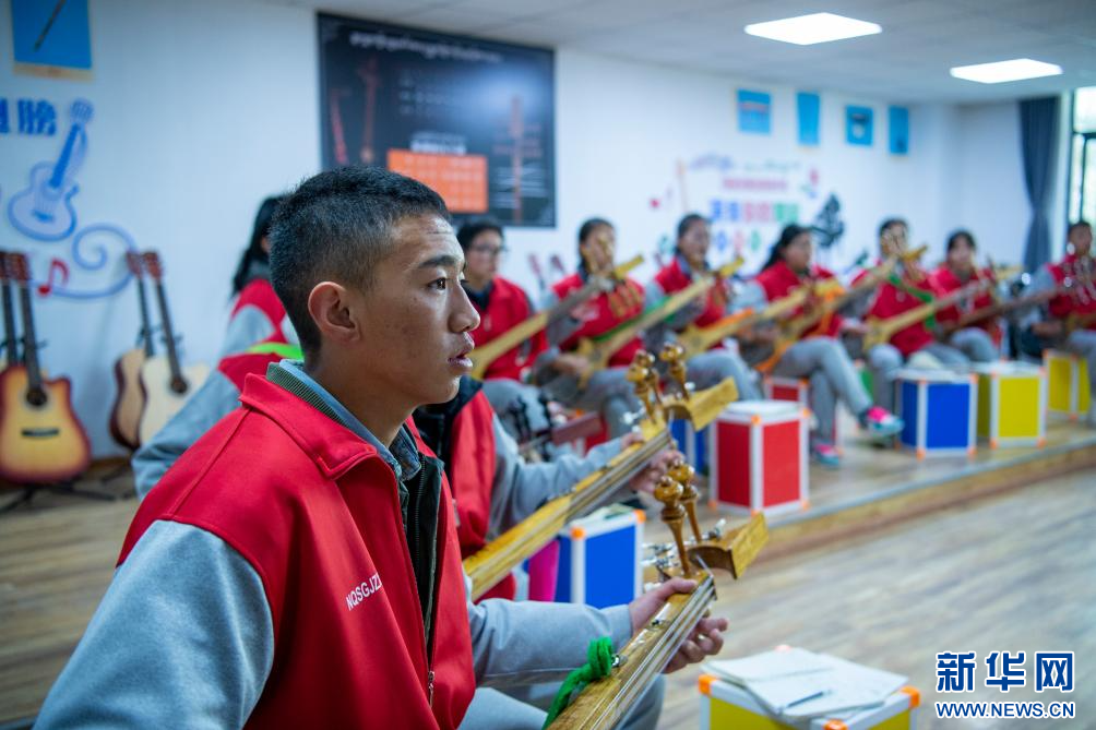 圖為那曲市高級中學學生在彈奏扎念琴(9月5日攝)。新華網(wǎng) 旦增努布 攝