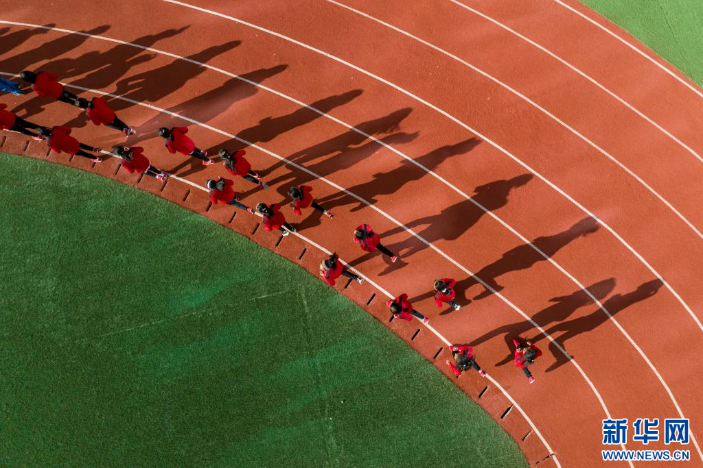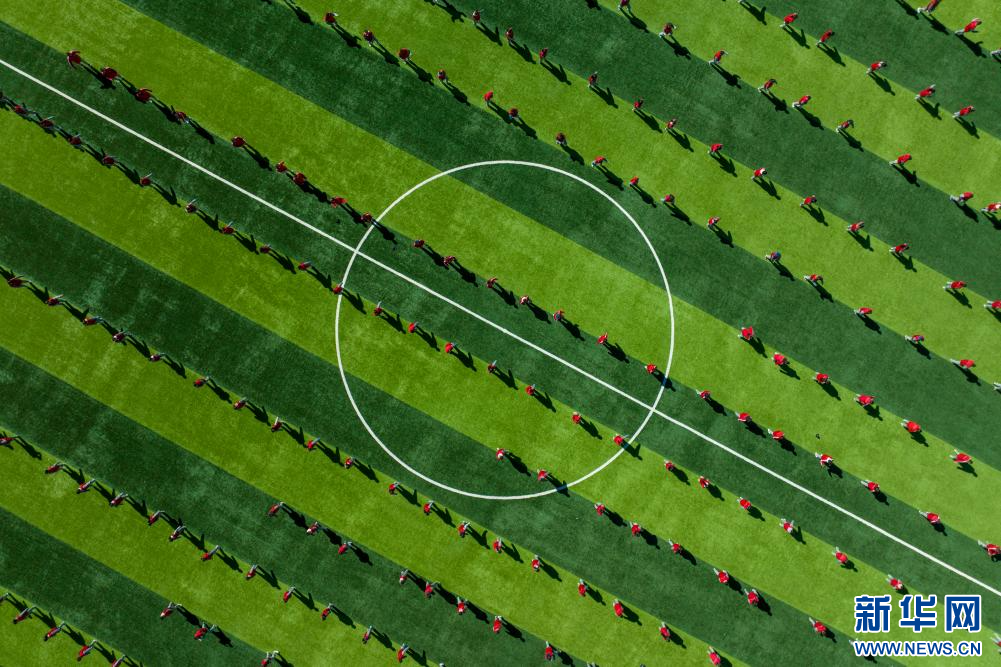 圖為那曲市第三小學學生在做體能訓練(9月5日攝,無人機照片)。新華網(wǎng) 旦增努布 攝