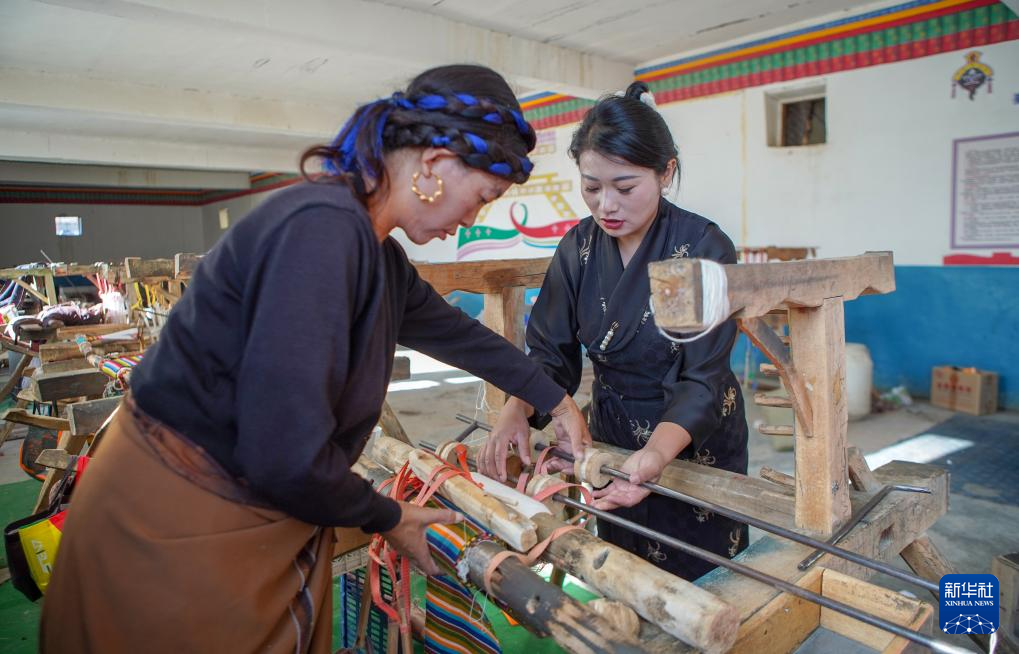 10月9日,旦增卓嘎與合作社工人一起組裝傳統(tǒng)織機。新華社記者邵澤東 攝