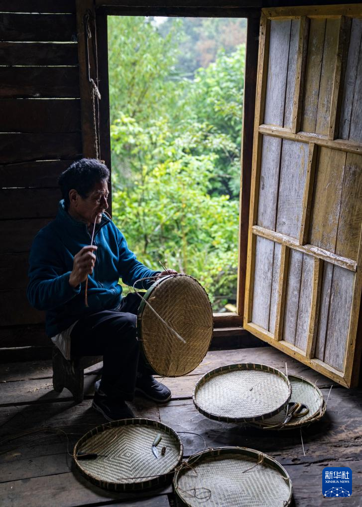 在西藏墨脫縣背崩鄉(xiāng)巴登村,一名村民在編織竹筐(10月11日攝)。新華社記者 孫非 攝