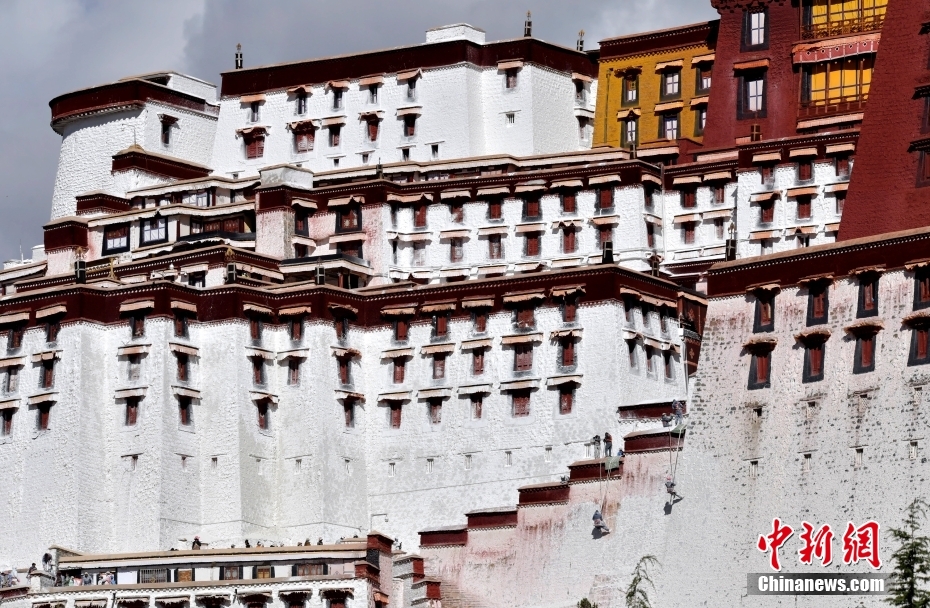 10月19日,西藏拉薩,工作人員對布達拉宮外墻噴灑涂料。每年秋冬交替時節(jié),布達拉宮外墻都要進行粉刷“美顏”。按照慣例,每季粉刷將在藏歷9月22日“神降節(jié)”前完成。