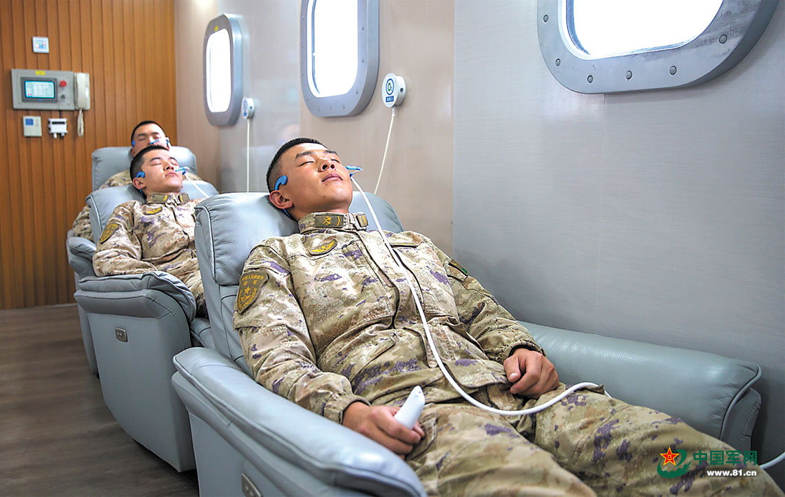 吃好每頓飯,在邊防部隊(duì)已不是新鮮事。對(duì)第一次走上高原的官兵來說,最擔(dān)心的是缺氧。筆者在海拔4700多米的某邊防連看到,剛走下哨位的戰(zhàn)士們進(jìn)入微壓氧艙進(jìn)行休整。看了一會(huì)兒書,聽了一會(huì)兒音樂,幾名戰(zhàn)士很快便進(jìn)入夢(mèng)鄉(xiāng)。