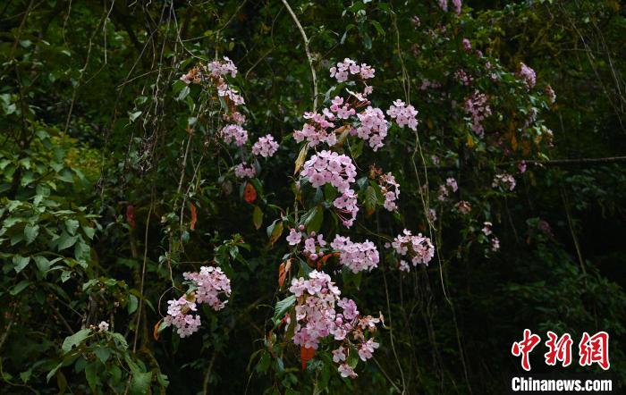 因氣候濕潤(rùn),森林里的樹(shù)上長(zhǎng)滿了藤蔓植物、蕨類植物、苔蘚。在這里,植物從空間上獲得了最大密度的生長(zhǎng)。開(kāi)滿粉色花朵的植物從樹(shù)上倒掛而下,科考人員一眼辨認(rèn)出是大花水東哥,奈何正是花期無(wú)法采集種子。